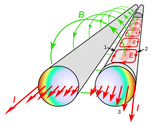 - Unterteilen der Volldrähte zu Hochfrequenzlitzen (separat isolierte Litzendrähte), ähnlich wie bei den Blechpaketen für Transformatoren. Es ist hierbei nicht notwendig, dass die Litzen, wie bei der echten HF-Litze verflochten sind, ein verdrehen der Litzen über die Längsachse reicht aus. Eine „falsche“, d. h. nur verdrillte, "Hochfrequenzlitze" bringt bereits die gewünschte Verbesserung, da die Litzendrähte auf gleichen Durchmessern die Lage im Streufeld wechseln (Drillleiter[2]).