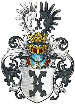Blasonierung: In Silber ein schwarzes Mühleisen (oder Maueranker wie bei den Plesse?), teilweise stehend, teilweise querliegend dargestellt. Auf dem gekrönten Helm mit schwarz-silbernen Helmdecken ein offener rechts silberner, links schwarzer Flug, zwischen dem sich die Schildfigur wiederholt.[1]