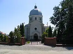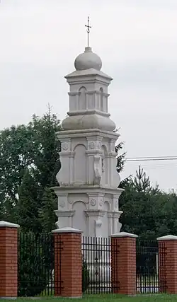 - moderne Kirche in Ostrów, alter Obelisk (Kreuz über Halbmond)