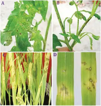 Pseudomonas cannabina pv. alisalensis: Infektionen des Stammes PSa1_3 auf Tomatenblätter (A), Tomatenstägel (B), Haferblätter (C) und Bromus diandrus-Blättern(D) | ||||||||||||