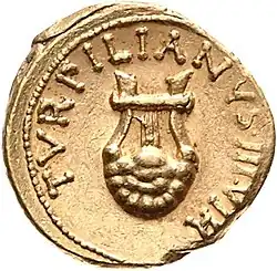 Man hat aber auch angenommen, der Münzmeister Turpilianus verehre mit diesen Münzen seinen Vorfahren, den Komödiendichter Turpilius.[11] Dieser schrieb etwa drei Generationen vor Turpilianus beliebte Palliata, denen vor allem metrische Vielfalt und sprachliche Farbigkeit nachgerühmt wurde. Die Anmut seiner zahlreichen Komödien verhalfen ihm zu dem Ehrentitel Novella Sirena, was zumindest das Münzmotiv der Sirene bei Turpilianus zwanglos erklären könnte.[28]