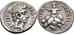- ↑ Bibliothèque Nationale, Catalogue des monnaies de l’Empire romain Nr. 140-146; Coins of the Roman Empire in the British Museum Nr. 18,19 u. 21; The Roman Imperial Coinage Nr. 101-103; Abb. in Herbert Appold Grueber: Coins of the Roman Republic in the British Museum. Band 3. British Museum, London 1910, Tafel LXVI Nr. 5–7; Jean-Baptiste Giard: Catalogue des monnaies de l’empire romain. I. Auguste. Bibliothèque nationale de France, Poinsignon numismatique, Paris 1976, Nr. 140–144. Motiv auch bei Aquillius (Herbert Appold Grueber: Coins of the Roman Republic in the British Museum. Band 3. British Museum, London 1910, Tafel LXVI Nr. 19; Jean-Baptiste Giard: Catalogue des monnaies de l’empire romain. I. Auguste. Bibliothèque nationale de France, Poinsignon numismatique, Paris 1976, Nr. 177–178) und mit anderem Bild (Herbert Appold Grueber: Coins of the Roman Republic in the British Museum. Band 3. British Museum, London 1910, Tafel LXVI Nr. 20).