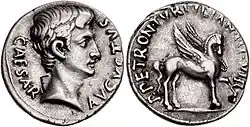 - ↑ Edmund Groag: Petronius 74. In: Paulys Realencyclopädie der classischen Altertumswissenschaft (RE). Band XIX,1, Stuttgart 1937, Sp. 1227.; Bibliothèque Nationale, Catalogue des monnaies de l’Empire romain Nr. 118-139, Coins of the Roman Empire in the British Museum Nr. 10 u. 14, The Roman Imperial Coinage Nr. 98-99, Abb. in Herbert Appold Grueber: Coins of the Roman Republic in the British Museum. Band 3. British Museum, London 1910, Tafel LXVI Nr. 8–10; Anne S. Robertson: Roman Imperial Coins in the Hunter Coin Cabinet, University of Glasgow. Band 1: Augustus to Nerva. Oxford University Press, London 1962, Tafel 1, Nr. 4, Jean-Baptiste Giard: Catalogue des monnaies de l’empire romain. I. Auguste. Bibliothèque nationale de France, Poinsignon numismatique, Paris 1976, Nr. 118–139. Motiv auch bei Aquillius (Jean-Baptiste Giard: Catalogue des monnaies de l’empire romain. I. Auguste. Bibliothèque nationale de France, Poinsignon numismatique, Paris 1976, Nr. 173–175) u. Durmius (Herbert Appold Grueber: Coins of the Roman Republic in the British Museum. Band 3. British Museum, London 1910, Tafel LXVII Nr. 9; Jean-Baptiste Giard: Catalogue des monnaies de l’empire romain. I. Auguste. Bibliothèque nationale de France, Poinsignon numismatique, Paris 1976, Nr. 199–205).