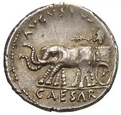 - Ein Mann mit Ölzweig lenkt eine Biga, die von zwei Elephanten gezogen wird. Die Münze feiert die indische Gesandtschaft des Jahres 20 v. Chr.[5]