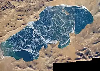 | Satellitenbild: Puma Yumco in der unteren Bildmitte, darüber der See Yamdrok Tso (Nov. 1997) | ||