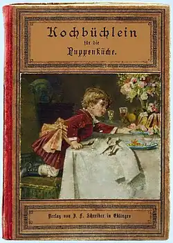Bekannte damalige Kochbuchautorinnen wie Christine Charlotte Riedl (1801–1873) und Henriette Davidis (1801–1876) verfassten auch Puppen- oder Kinderkochbücher mit vereinfachten Rezeptanweisungen.[37] Henriette Davidis Kinderkochbuch „Puppenköchin Anna“ (1856) zählte zu den bekanntesten Titeln. Das wohl erfolgreichste Puppenkochbuch war das „Kochbüchlein für die Puppenküche“ von Julie Bimbach (1853). Die inhaltliche und formale Gestaltung der Puppenkochbücher entsprach dabei den damals gesellschaftlich etablierten Vorstellungen über die Erziehung von Mädchen zur Hausfrau und Mutter.[38] In „Haustöchterchens Kochschule“ (1895) schrieb Anna Jäger: „Was Dir jetzt ein heiteres Spiel ist, wird Dir auch später eine liebe Thätigkeit sein, und wenn sie Dir in fernen Tagen einmal zur Pflicht wird, wird sie Dir lieb sein und Du wirst spielend erfüllen, was Du schon im Spiele geübt.“[39] Diese Kochschule für das Kochen am Puppenherd richtete sich an Mädchen von bis zu 16 Jahren.