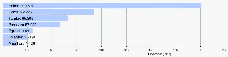 Der Distrikt ist in die vier Subdivisionen Contai, Egra, Haldia und Tamluk aufgeteilt. Diese wiederum sind weiter in insgesamt 25 Blocks und 5 kreisfreie Städte (Municipalities; Contai, Egra, Haldia, Panskura und Tamluk) aufgeteilt[4][5]. Es gibt insgesamt 5 Municipalities (Stadtverwaltungen) und 223 Gram Panchayat (Dorfverwaltungen) in 3500 Dörfern gegliedert[6].