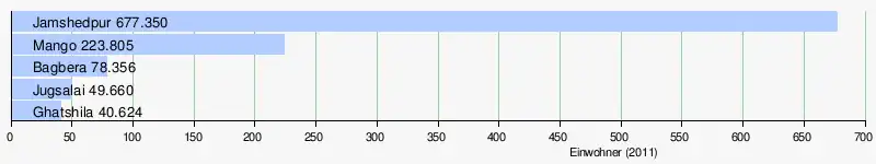 Weitere Städte mit jeweils mehr als 10.000 Einwohnern sind Chhota Gobindpur (31.843 Einwohner), Musabani (31.035 Einwohner), Haludbani (25.360 Einwohner), Sarjamda (23.788 Einwohner), Ghorabandha (20.718 Einwohner), Gadhra (18.801 Einwohner), Jadugora (18.563 Einwohner), Chakulia (16.306 Einwohner) und Haludpukhur (10.485 Einwohner).