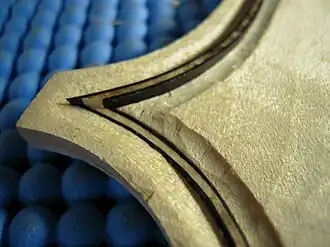 Mit der Zeit wurden auch Perlmutt oder Abalone und andere harte Einlegematerialien verwendet, um besonders dekorative Effekte zu erzielen. Aufwändige Einlegearbeiten sind am häufigsten bei bundierten Instrumenten zu finden. Laminate und Verbundstoffe aus perlmuttartigen Muscheln und synthetischen Materialien, die als fake, faux oder shin paua bezeichnet werden, werden manchmal von Geigenbauern verwendet. Der Kanal, der für die Einlage der Randeinlage geschnitten wird, kann die Flexibilität der Platten an der Verbindung mit den Zargen erhöhen, was sich auf die Tonhöhe und das Sustain eines Instruments auswirkt. Breite Ziereinlagen können die effektive Schwingungsfläche des Klangbodens verringern.