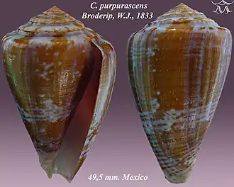 - George Washington Tryon: Manual of Conchology, structural and systematic, with illustrations of the species, vol. VI; Academy of Natural Sciences, Philadelphia 1884. C[onus] purpurascens Brod., S. 64f.