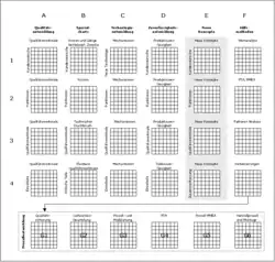 Im Bild ist die Matrix der Matrizen von Bob King dargestellt, die Spalten A bis D (Qualitätsentwicklung, Spezialcharts, Technologieentwicklung und Zuverlässigkeitsentwicklung) entstammen dem Ansatz von Yoji Akao. Die Spalten E (Neue Konzepte) und F (Hilfsmethoden) sowie die Zeile fünf (Prozessentwicklung) sind von Bob King eingebrachte Neuerungen, worin die Prozessentwicklung (G1 bis G6) durch einen gestrichelten Rahmen und die Konzeptplanung (Neue Konzepte) von S. Pugh durch eine graue Hinterlegung gekennzeichnet ist.