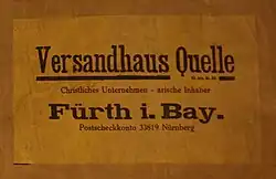 Verpackungsaufkleber des Versandhauses Quelle aus den 1930er oder 1940er Jahren mit dem Hinweis „Christliches Unternehmen – arische Inhaber“