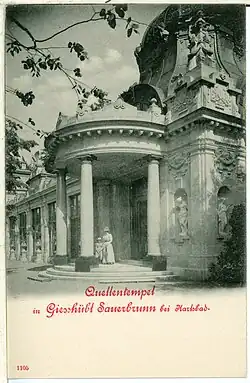 Seit 1852 wurde sie König-Otto-Quelle genannt und war bis zum Ende des 19. Jahrhunderts lediglich mit einem, im Jahre 1853 errichteten Brunnentempel mit einer, auf 14 Granitsäulen ruhenden klassizistischen Wandelhalle überbaut, in deren Mitte ein Brustbild des Königs Otto von Griechenland angebracht war. Die Firma Heinrich Mattoni schrieb bis zum 30. April 1897 einen öffentlichen Wettbewerb zum Bau eines Quellentempels in Form eines Pavillons an dieser Stelle aus. Es wurden insgesamt 23 Entwürfe von verschiedenen Architekten eingereicht, doch davon konnte keiner den ersten Platz belegen, sondern es wurden von der Firma Heinrich Mattoni zwei zweite Preise zu jeweils 900 Kronen vergeben. Die Preise erhielten Theodor Schreier und E. Lindner aus Wien sowie A. H. Pecha, ebenfalls aus Wien.[2] Im darauffolgenden Jahr wurde die alte hölzerne Kolonnadenhalle abgerissen und an gleicher Stelle unter Anleitung des österreichischen Architekten Karl Haybäck (1861–1926) der Quellentempel in aufwändiger Gestaltung unter Verwendung von reichlich Marmor errichtet.[3] Die Innenausstattung soll von dem von Anton Detoma gegründeten Kunstmarmorierer- und Stuckateurbetrieb gestaltet worden sein. Die offizielle Einweihung des Quellentempels fand mit Eröffnung der Kursaison am 1. Mai 1900 statt.[4] Im Tempel befand sich unter einem Glasdeckel die neugefasste König-Otto-Quelle. Im Inneren befand sich u. a. eine Marmortafel mit dem Spruch DER HERRLICHEN QUELLE GEWIDMET VON HEINRICH EDLER VON MATTONI ANNO DOMINI 1898. 1911 wurde in südwestliche Richtung an den Quellentempel noch eine Füllhalle in ähnlicher Gestaltung angebaut.
