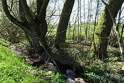 - Der Bestand im Quellgebiet zeichnet sich nach der Grunddatenerfassung im Blick auf bewertungsrelevante Habitatstrukturen durch einen besonderen Artenreichtum aus, von dessen großem Angebot an Blüten, Samen und Früchten zahlreiche Insekten profitieren. Auf der krautreichen und mehrschichtig aufgebauten Fläche hat sich ein kleinräumig wechselndes Mosaik ausbilden können.[5]
