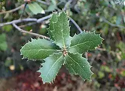 Die wechselständigen und kurz gestielten Laubblätter sind etwa 2,5 bis 7 Zentimeter lang. Sie sind dünnledrig, steif, kahl, eiförmig bis verkehrt-eiförmig und meist spitz und stachelspitzig, besonders bei jungen Exemplaren. Teils sind sie grob stachelspitzig gezähnt oder ganzrandig. Die Basis ist leicht herzförmig bis abgerundet oder stumpf bis spitz. Der Blattstiel ist meist kahl. Die leicht glänzenden Blätter sind unterseits heller.