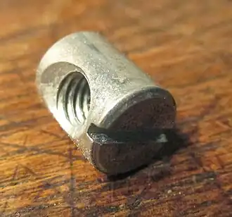 Der Quermutterbolzen wird in die passende Drehlage mit einem Schlitzschraubendreher gebracht. Der Schlitz am Bolzen ist parallel zu seiner Querbohrung, wodurch die richtige Drehlage von außen kontrollierbar ist. Die Montage wird zudem erleichtert, indem die Schraube leicht angespitzt und die Querbohrung mit kurzen Einführungstrichtern versehen ist.
