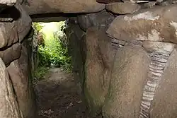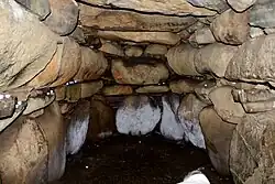 In der Kammer fand er kleine Tontöpfe, eine unverzierte Schale mit flachem Boden, einen Dolch und einen Abschlag aus Feuerstein. Menschliche Knochen lagen an verschiedenen Stellen. Im Grabhügel wurden Feuerstellen, Urnenbestattungen und eine Steinsetzung aus der Bronzezeit gefunden.