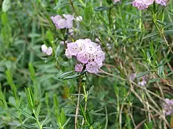 Ansonsten findet man aus der Familie der Heidekrautgewächse Kalmia polifolia und Kalmia angustifolia aus der Gattung der Lorbeerrosen, dann Torfgränke (Chamaedaphne calyculata) und Grönländischer Porst (Rhododendron groenlandicum), aus der Familie der Sauergrasgewächse vor allem Carex oligosperma aus der Gattung der Seggen, Eriophorum virginicum aus der Gattung der Wollgräser, der auch das Scheiden-Wollgras (Eriophorum vaginatum) und das Schmalblättrige Wollgras (Eriophorum angustifolium) angehören. An Bäumen finden sich Schwarz-Fichte (Picea mariana) und Ostamerikanische Lärche (Larix laricina).
