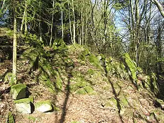 Von der ehemaligen Burganlage sind eine Art Ringwall mit Graben und eine Treppe erhalten sowie Trockenmauerwerk.