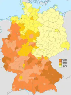 Infolge des im Augsburger Religionsfrieden und im Westfälischen Frieden festgelegten Regionalprinzips ist Deutschland immer noch konfessionell regional getrennt. Diese Spaltung ist jedoch nach der Integration der Heimatvertriebenen und Flüchtlinge aus den Ostgebieten des Deutschen Reiches nach dem Zweiten Weltkrieg weniger ausgeprägt als noch zu Anfang des 20. Jahrhunderts. Man kann den Süden und Westen als tendenziell katholisch bezeichnen (z. B. Bistum Passau mit 74,1 %, Bistum Aachen 50,8 % Katholikenanteil 2018). Die Einwohner der neuen Bundesländer sowie Berlins, Schleswig-Holsteins, Hamburgs und Bremens gehören überwiegend keiner der (beiden großen) christlichen Konfessionen an (Stand 2019).[19][20][21]