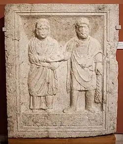 - Ebenfalls in der ersten Hälfte des 3. Jahrhunderts entstand die qualitätvolle Inschriftenplatte für den Ex-Decurio der Cohors milliaria Hemesenorum, Marcus Aurelius Monimus, der aus der syrischen Stadt Hemesa stammte und als Veteran mit 64 Jahren verstarb. Seine Frau Iulia Ticima und sein Sohn Aurelius Iulianus, ein Stallmeister beim Stab des consularischen Statthalters bzw. Heerführers, ließen für ihn ein Grabmal erbauen.[5]