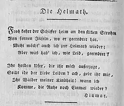 Heimath ist ein Entwurf oder das Bruchstück eines Entwurfs zu einer Hymne. Der Text gehört zu den in Edition und Interpretation schwierigen Manuskripten im Homburger Folioheft und wurde erstmals 1916 – ohne die Überschrift und Vers 1 – in Band 4 der von Norbert von Hellingrath und Friedrich Seebaß (1887–1963) begonnenen Ausgabe von Hölderlins Werken gedruckt.[13] In der Frankfurter Ausgabe erscheint er nicht als eigenständiges Gedicht. Die Ausgabe von Knaupp bietet einen mit der Stuttgarter Ausgabe identischen Text. Kurz und Braungart, Mieth sowie Schmidt „modernisieren“ wieder die Orthographie.