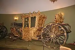 Es folgt ein kleiner Saal, dessen Exposition Erzeugnisse beinhaltet,[2] welche einst in der zum Zarenhof gehörenden Werkstatt für Pferde- und Reiterausrüstung hergestellt wurden, sowie schließlich der Equipagensaal mit über einem Dutzend ehemals den Zaren gehörenden Originalkutschen aus dem 17. und dem 18. Jahrhundert. Außer mehreren russischen Paradekutschen der Kaiserinnen Anna, Elisabeth und Katharina II. (darunter sogar eine Schlittenkutsche für den Winter) ist ein in England hergestellter Paradewagen zu sehen, den Zar Boris Godunow 1603 von König Jakob I. geschenkt bekommen hatte.