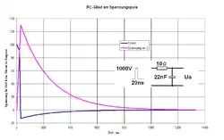 Verlauf von Ladestrom (blau) und Kondensatorspannung (rosa) an einem RC-Glied an einem Spannungsimpuls