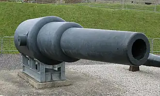 Die ersten Hinterladergeschütze (RBL – Rifled Breech Loading) mit gezogenem Lauf wurden von Armstrong entwickelt und 1859 in der britischen Armee und der Royal Navy eingeführt. Diese Geschütze konnten im Einsatz jedoch nicht überzeugen. Daher gingen die britische Armee und die Royal Navy ab Mitte der 1860er Jahre wieder zu Vorderladern über. Der gezogene Lauf wurde jedoch beibehalten.[2] Mit der Verbesserung der Panzerung von Kriegsschiffen ergab sich die Notwendigkeit, die Durchschlagsleistung der Geschütze zu erhöhen. Dies führte zur Entwicklung immer großkalibriger Geschütze.