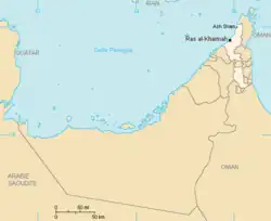 | Chaur Hulaila | 25° 54′ 0″ N, 56° 2′ 32″ O | Grenzt im Norden an Chaur Chuwair, im Süden an ar-Rams. Beinhaltet die RAK Free Trade Zone sowie weitere industriell genutzte Flächen. Chaur Khuwair lässt sich vom nahegelegenen Dhaya-Fort gut überblicken. Der Name ist auf die nahegelegene Siedlung al-Hulaila zurückzuführen. Die Bucht wird durch die Insel Hulaila vom Persischen Golf abgegrenzt. Diese Insel ist einer der wichtigsten archäologischen Fundstätten in den VAE. Die ältesten Fundstücke stammen aus der Zeit des Sassanidenreichs.[2] | |