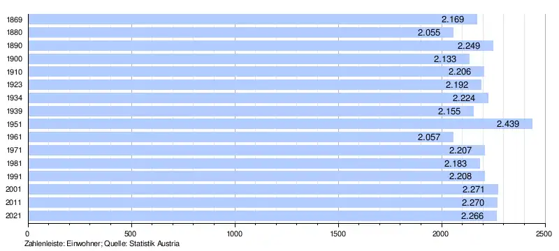 1991 hatte die Gemeinde laut Volkszählung 2.208 Einwohner, 2001 dann 2.271 Einwohner. Von 2001 bis 2011 war die Geburtenbilanz +71 und die Wanderungsbilanz −72, sodass die Bevölkerungszahl auf 2.270 zurückging. Sie blieb bis 2018 konstant.[2]
