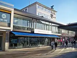 Die Ladenzeile an der Porschestraße besteht aus zwei Geschossen, die durch einen trichterförmigen Eingang vertikal halbiert werden. Im Erdgeschoss befinden sich große Fensterflächen. Die ebenso großflächigen Fenster des Obergeschosses kragen aus und werden von schmalen Fensterprofilen und Stahlstützen gehalten. Den oberen Abschluss bildet ein erneut auskragendes Flachdach. Der Haupteingangsbereich ist mit großen Vitrinen und einem Mosaikboden ausgestattet.[1]