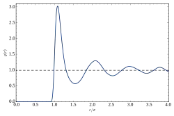 Radiale Verteilungsfunktion einer Lennard-Jones-Flüssigkeit. Die radiale Verteilungsfunktion nimmt um praktisch den Wert 0 an, da die Teilchen mit einem Lennard-Jones-Potential wechselwirken und somit praktisch nicht überlappen können.