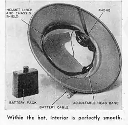 Der Radiohut hatte eine interne Anodenbatterie für die Anodenspannung von 22,5 V und 1,5 V für die Heizung der Elektronenröhren. Diese Spannungen waren für die Verwendung in einem Hut unbedenklich, zumal die volle Plattenspannung über den Kopfhörer abgenommen wurde. Diese Technik wurde in vielen einfachen Radios dieser Zeit verwendet, von denen einige eine Spannung von 90 V oder mehr über den Kopfhörern lieferten. Die Batterie konnte das Radio bis zu 20 Stunden mit elektrischer Energie versorgen. Das Radio wurde mit einem Knopf zwischen den beiden Röhren eingestellt und empfing das Mittelwellenband von 540 kHz bis 1,6 MHz. Die typischen Tisch- oder Konsolenradios dieser Zeit waren mit fünf oder sechs Röhren bestückt, um eine besseren Empfang zu erzielen.