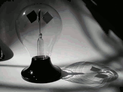 Die von William Crookes erfundene Lichtmühle[1] – ein sich bei Beleuchtung drehendes Flügelrad – misst nicht den mechanischen Strahlungsdruck des Lichtes, sondern wird durch thermische Molekularbewegung angetrieben. Das Innere des Glaskolbens ist weitgehend evakuiert.