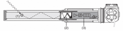 Funktionsweise eines radiometrischen Kompakttransmitters: (1) Gammastrahlen erzeugen im Szintillator Lichtblitze, (2) Der Photomultiplier wandelt die Blitze in elektrische Impulse um und verstärkt sie, (3) Die Auswerteelektronik berechnet aus der Impulsrate den Messwert.