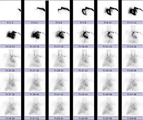 Radionuklidangiografie im Rahmen einer 3-Phasen-Skelettszintigrafie. Dynamische Aufnahmen von Brustkorb und Hals; ein Bild alle 2 Sekunden. Der Tracer strömt über die linke Vena subclavia in die rechte Herzkammer (Bild 7–8), die Lunge (Bild 9–10), die linke Herzkammer (Bild 13–14) in die großen Arterien (Arteria subclavia beidseits, Arteria carotis communis beidseits, Aorta abdominalis; Bilder 15–16 bis 23–24). Beachte geringe Tracer-Spuren an einzelnen Venenklappen der Vena subclavia bis etwa Bild 45–46. Keine auffällig vermehrte Durchblutung in der Region der rechten Schulter. (Klinische Fragestellung: Osteomyelitis?)