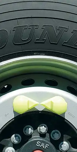 Radmutterindikatoren dienen der Sicherung der Räder von Fahrzeugen, vornehmlich Lastkraftwagen (LKW), um Unfälle durch Lösen der Radmuttern zu verhindern. Sie sind einfach und ohne Werkzeug zu montieren. Jeder Fahrer eines LKW muss sich vor Fahrtantritt vom sicheren Zustand der Räder und der Bereifung vergewissern; dies verlangen Berufsgenossenschaften in ihren Unfallverhütungsvorschriften.[1][2] Zeitdruck und Unwissenheit führen aber häufig dazu, dass diese Prüfungen nicht durchgeführt werden. Fast ein Drittel aller Fahrer kontrolliert nach den Ergebnissen einer in Großbritannien erstellten Studie[3] die Radmuttern vor Fahrtantritt nicht. In einem Newsletter des deutschen Bundesverbandes für den Reifenhandel (BRV) von 2012 heißt es zur Relevanz des Sicherheitsaspektes: „Die Vorteile (...) liegen auf der Hand: Für den Fuhrparkleiter bedeuten sie eine erhebliche Erleichterung und Verkürzung der Kontrollrundgänge sowie eine Verbesserung der Wartung und Sicherheit der Flotte. Insgesamt erhöhen sie für alle Verkehrsteilnehmer, ob Fahrer, Fußgänger oder Flottenbesitzer, die Sicherheit auf den Straßen deutlich.“[4] Radmutterindikatoren sind in zahlreichen Varianten und Schlüsselweiten erhältlich. Sowohl Fahrer als auch Kontrollbehörden wie die Polizei können auf einen Blick erkennen, ob die Radmuttern gesichert sind.