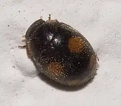 Die Käfer werden 2,5 bis 4,8 Millimeter lang und haben einen stark behaarten Körper. Ihre beiden Deckflügel sind schwarz und tragen jeweils zwei große orangerote Punkte. Die beiden vorne liegenden Punkte sind größer als die beiden an den Enden der Deckflügel. An den Seiten des nach unten gekrümmten Halsschildes liegt auch noch je ein kleiner roter Fleck. Die Stirnplatte (Clypeus), der vordere Teil des Halsschildes, umfasst die Facettenaugen zur Gänze. Dies ist ein Unterscheidungsmerkmal zu anderen kleinen Marienkäferarten. Der Clypeus ist bei den Männchen gelblich weiß, bei den Weibchen schwarz. Die Facettenaugen sind, wie der Rest des Körpers, schwarz.