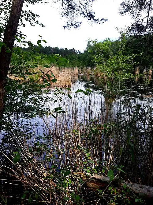 Der zentrale Teil des Schutzgebietes besteht aus einer teils mit Schilf bewachsenen Wasserfläche, die an den Rändern stellenweise in Bruchwald übergeht. Im Süden finden sich Großseggenbestände. In den Feuchtgebieten kommen Walzen-Segge, Scheinzypergras-Segge, Sumpf-Schwertlilie, Gift-Hahnenfuß und Gewöhnlicher Froschlöffel vor. Westlich und nordwestlich grenzt ein bodensaurer Eichenwald an, der mit flachen wassergefüllten Abbau-Pfannen durchsetzt ist. An sumpfigen Stellen wachsen Bärlappe, Torfmoose und Lebermoose. Im Norden dominieren auf einer Sandhalde Kiefern und standortfremde Fichten.[4]