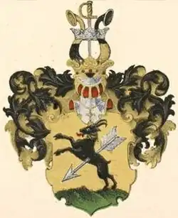Das Wappen (1624) zeigt in Gold auf grünem Hügel ein aufgerichteter schwarzer Steinbock, dessen Hals von einer goldenen Blätterkrone umschlossen und dessen Brust von einem schrägaufrechten silbernen Pfeil durchbohrt ist. Auf dem gekrönten Helm mit schwarz-goldenen Decken zwischen zwei oben durch eine goldene Blätterkrone zusammengehaltene gold-schwarz übereck geteilte Büffelhörner, ein durch die Krone gestecktes, gold begrifftes gestürztes Schwert.