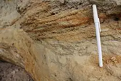 In der Nordwand der ehemaligen Sandgrube ist ein etwa fünf Meter mächtiges Profil der Oberen Meeresmolasse (OMM) aufgeschlossen. Es handelt sich um meist karbonatisch zementierte, überwiegend geringverfestigte Sandsteine, die kleine Gerölle und Muschelschill enthalten. Stellenweise ist deutlich Schrägschichtung erkennbar. An identifizierbaren Fossilien treten vor allem Überreste von meeresbewohnenden Weichtieren auf, in erster Linie Austern der Art Crassostrea giengensis sowie Turmschnecken und Herzmuscheln.[1] Neben den Schrägschichtungsstrukturen sind im Aufschluss auch Kreuzschichtungen zu finden. Diese entstehen durch wechselnde Strömungsrichtungen des Meerwassers, wie sie beispielsweise in Wattgebieten aufgrund des Gezeitenrhythmus auftreten.