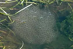 Die Eier sind fast schwarz gefärbt, nur mit einer winzigen Aufhellung am unteren Eipol. Der Eidurchmesser (ohne umgebende Gallerte) beträgt 1,7 bis 2,8 Millimeter; die Gallerte hat bei „reifem“ Laich 8 bis 10 Millimeter Durchmesser. Nach dem Ablaichen quillt diese auf und die Ballen steigen durch Gasbildung meistens an die Wasseroberfläche. Sie sind nun als große, treibende „Fladen“ gut zu sehen. Die Gallerte hat eine Art Brennglasfunktion und so erwärmen sich die oberen und mittleren Eier schneller als die unten liegenden und die entsprechenden Keimlinge kommen schneller zur Entwicklung. Andererseits besteht im Frühjahr die Gefahr des Überfrierens und Absterbens vor allem für die oberen und äußeren Eier eines Laichballens. Wird ein Laichklumpen umgedreht (mit den unteren, hellen Eipolen nach oben zeigend), kann dies ebenfalls zum Absterben führen.