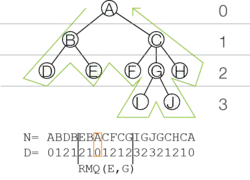 Die Reduktion beinhaltet eine Eulertour (bzw. einen in-Order Baumtraversal) in Zeit über den LCA-Baum zur Abbildung in ein Array , wobei für jedes Element in eine entsprechende Traversalnummer in gespeichert wird, indem beim Abstieg um dekrementiert (bzw. beim Aufstieg inkrementiert) wird, siehe hierzu Abbildung 6. Das Array benötigt linear viel Platz, weil die Kantenanzahl des Ursprungsbaumes durch dessen Knoten beschränkt ist. Für das Array kann nun die zuvor-beschriebene Vorberechnung für RMQs durchgeführt werden. Zur Lösung des LCA-Problems gilt nun: , wobei die Position der Eingabeknoten innerhalb kennzeichnen.