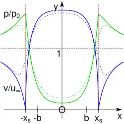 Die gestrichelten Linien zeigen die Verläufe auf einer benachbarten Stromlinie. Auch hier durchläuft der Druck vor dem Körper ein Maximum und bremst die Geschwindigkeit auf ein Minimum ab. Zur Mitte des Ovals sinkt der Druck auf ein Minimum und wird die Geschwindigkeit entsprechend maximal. Der Verlauf ist auch hier symmetrisch zur y-Achse.