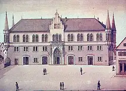 1872 wurde das Rathaus in die ehemalige Fruchthalle am Marktplatz verlegt. Diese war von Johann Georg Rupp im neogotischen Stil erbaut worden. Als das Rathaus dorthin verlegt wurde, erfolgte ein entsprechender Um- und Erweiterungsbau durch Baurat Berner. Das Gebäude hatte vier Erker und einen Mittelrisalit mit Uhrengiebel und Stadtwappen. Das Gebäude wurde 1945 durch Bomben zerstört.[4]