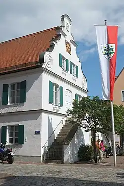 Das Rathaus in der Mitte des Stadtplatzes wurde durch den Baumeister Andreas Adler an der Stelle des 1704 während des Spanischen Erbfolgekrieges zerstörten gotischen Vorgängerbaus errichtet. Der freistehende, zweigeschossige Satteldachbau mit Volutengiebeln und Freitreppe wurde mehrfach verändert. Im Erdgeschoss befanden sich lange Zeit die Schranne, das Brothaus, das Fleischhaus, die Waage und Läden.