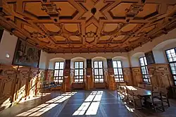 Im zweiten Obergeschoss des Augsburger Rathauses gelegen, umfasst der Goldene Saal eine Fläche von 552 m² bei einer Deckenhöhe von 14 Metern. Mit seinen beeindruckenden Portalen, den üppigen Wandmalereien, ausgeführt von Matthias Kager und nicht zuletzt der prachtvollen Kassettendecke galt er schon zu Zeiten seiner Entstehung als Höhepunkt künstlerischer Innenraumgestaltung.[7] Seinen Namen bezieht der Saal von dem reichhaltigen Goldschmuck, der seine Einrichtung ziert.