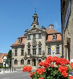Der zweigeschossige Mansarddachbau besteht aus Sandstein und trägt auf dem Dach einen Glockenturm. An der Südwestecke des Gebäudes stand ein Pranger. Das Gebäude weist auf der Südseite einen Mittelrisalit und eine Vortreppe auf. Die Rokokostatuen der Fassade stammen von Friedrich Maucher und Johann Peter Wagner.[1] Nach der Bombardierung im Zweiten Weltkrieg, bei dem das Gebäude zum Teil schwer beschädigt worden ist, wurde es 1950 rekonstruiert.[1]
