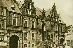 Es handelt sich um einen traufständigen, zweigeschossigen Bau auf hohem Sockel in den typischen Formen der Nordischen Renaissance. Er ist in Backstein errichtet und mit Sandsteinelementen gegliedert. Die Front zieren zwei hohe Zwerchhäuser mit geschweiften Giebeln, die einen kleineren geschweiften Mittelgiebel einschließen. Das Hauptportal wird über eine zweiseitige Freitreppe erreicht. Auf beiden Seiten führen zwei große Durchfahrten zu den dahinter liegenden Straßen.